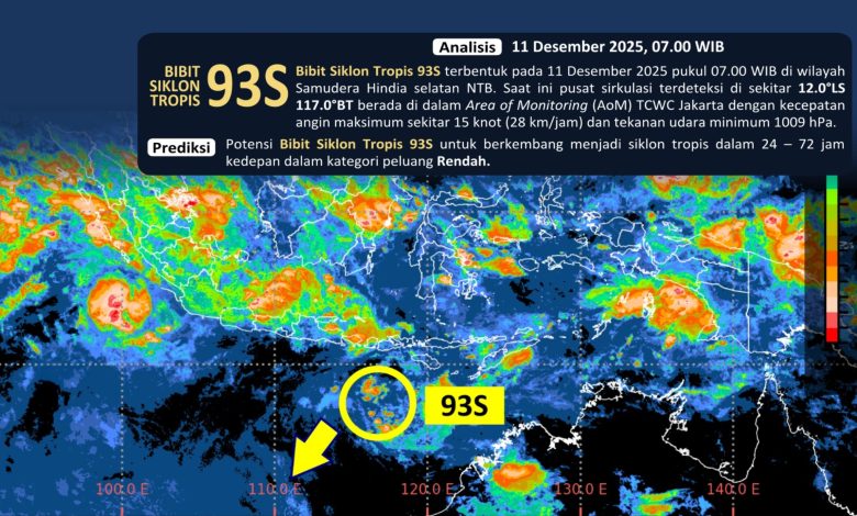Sebelumnya, 93S mulai terbentuk pada 11 Desember 2025 pukul 07:00 WIB dengan pusat sirkulasi di sekitar 12.0°LS–117.0°BT dan masuk ke dalam dalam Area of Monitoring (AoM) Tropical Cyclone Warning Centre (TCWC) Jakarta.
