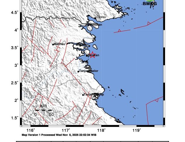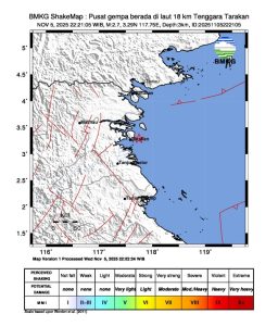 Dampak Gempa Bumi Berdasarkan laporan masyarakat, gempa bumi ini dirasakan di Tarakan dengan intensitas II-III MMI (Getaran dirasakan nyata dalam rumah. Terasa seakan-akan ada truk berlalu.), ungkap Rasmid, M.Si ,sebagaimana keterangan tertulis yang diterima redaksi persuasi-news.com pada Rabu (5/11/2025).