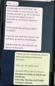 Pola serta isi pesan yang dikirimkan ke North Jakarta Intercultural School (NJIS) Kelapa Gading tersebut sama seperti yang dialamatkan kepada Jakarta Nanyang School (JNS) di Pagedangan, Kabupaten Tangerang, dan Mentari Intercultural School (MIS) di Kota Tangerang Selatan, sehari sebelumnya.