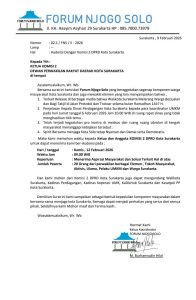 M. Burhannudin Hilal selaku Ketua Koordinator FORUM NJOGO SOLO, dalam surat yang diterima redaksi persuasi-news.com pada hari ini Senin (9/2/2026) mengatakan, kami dari Forum Njogo Solo yang beraggotakan segenap komponen warga masyarakat Kota Surakarta dan juga mewakili elemen yang lain menyampaikan bahwa,
