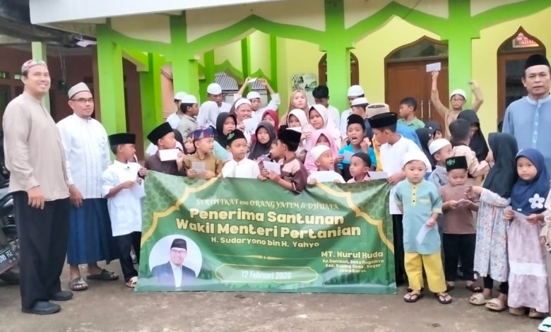 Wakil Menteri Pertanian (Wamentan) Republik Indonesia, H. Sudaryono bin H. Yahyo, menyalurkan santunan kepada 100 anak yatim dan dhuafa di RT 03 RW 07 Kampung Bambon, Desa Ragajaya, Kecamatan Bojong Gede, Kabupaten Bogor, Jawa Barat, Kamis (12/2/2026) sore.